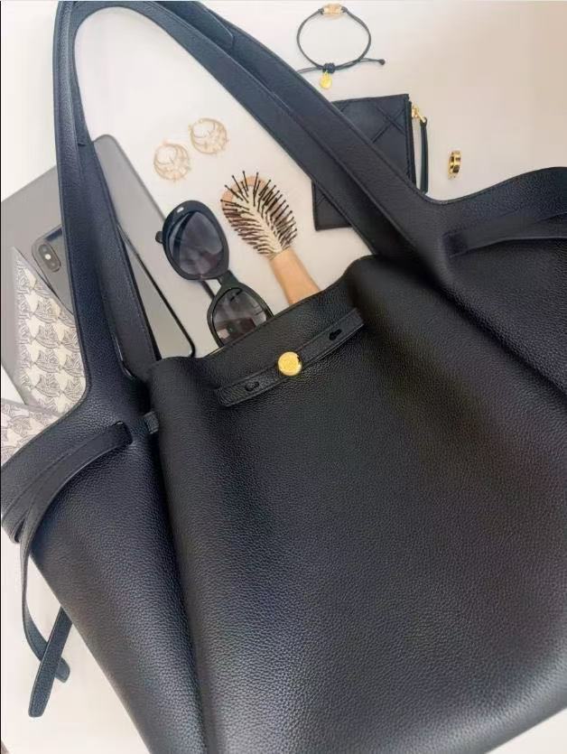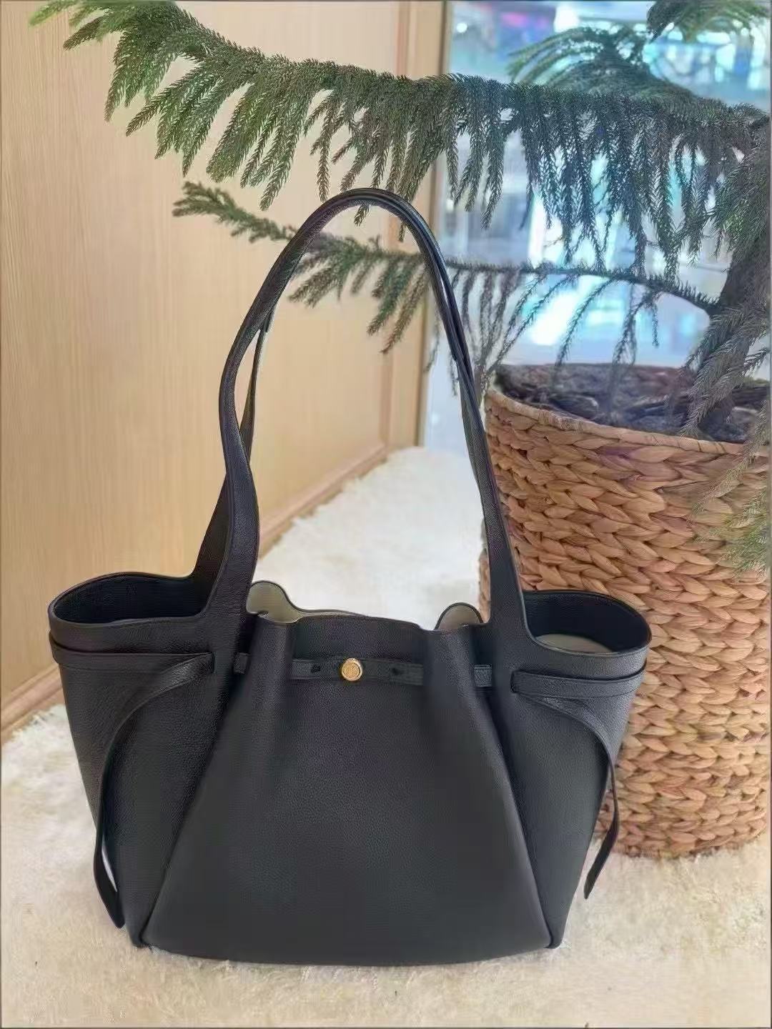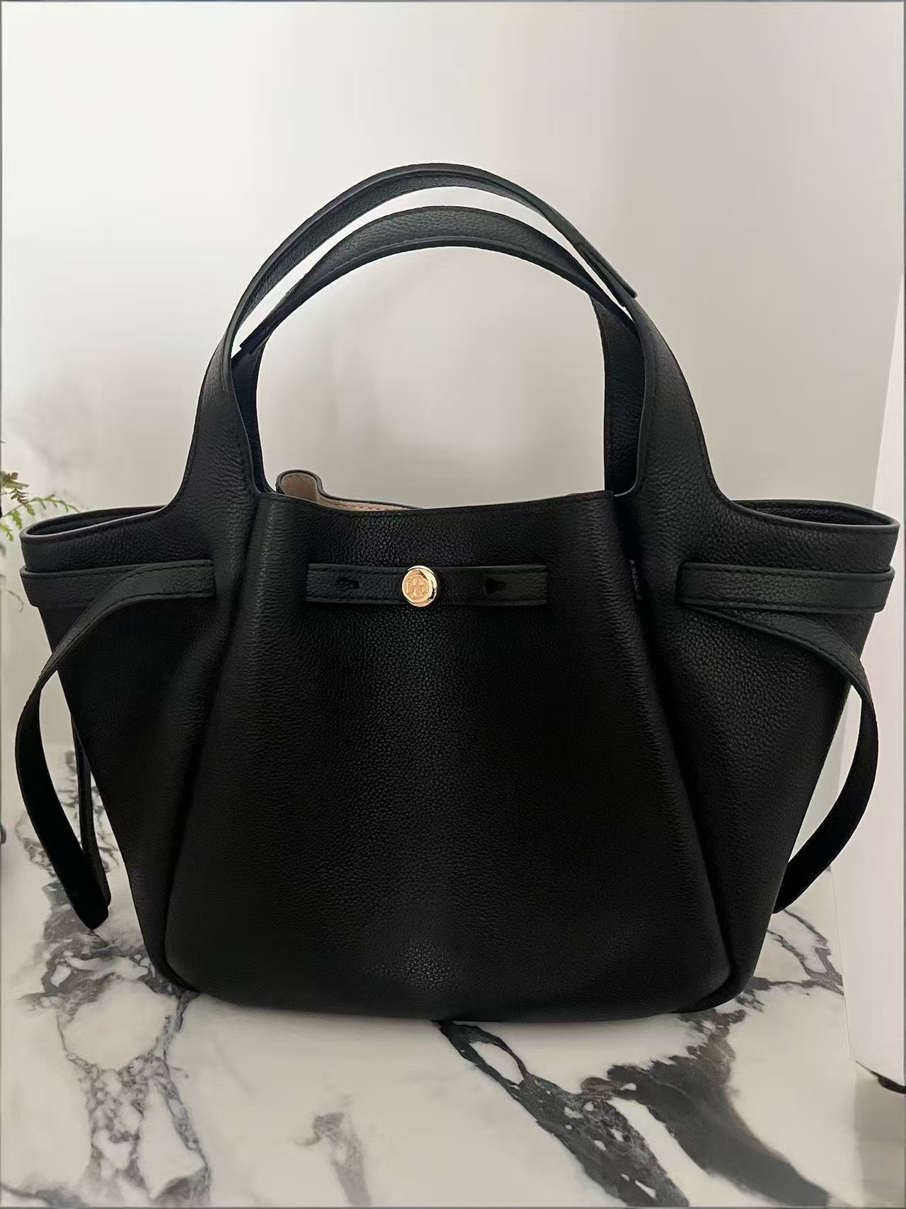 The ultimate everyday handbag. The Romy Tote is crafted in soft pebbled leather with a gently gathered silhouette. Lightweight with a spacious interior organized with a deep zip pocket, it can fit a phone, wallet, water bottle, notebook and laptop. Detailed with a slim belt and our new button logo. The tote, which can double as a carry-on for travel, has a wide shoulder strap for comfort. Crafted in partnership with a Leather Working Group-certified tannery, supporting high standards in leather manufacturing and chemical management.
